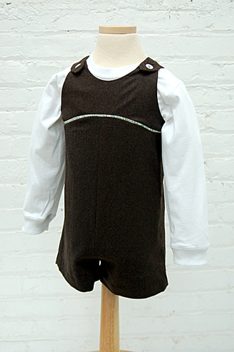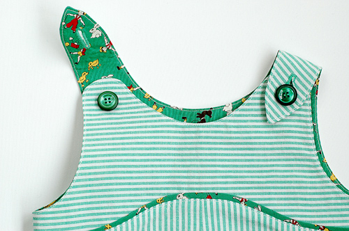 かわいいボタンつきの肩ストラップと胸元のカーブ切り替えが印象的なワンピースドレス/プレイスーツの型紙です。オプションで切り替えにパイピングを入れることもできます。