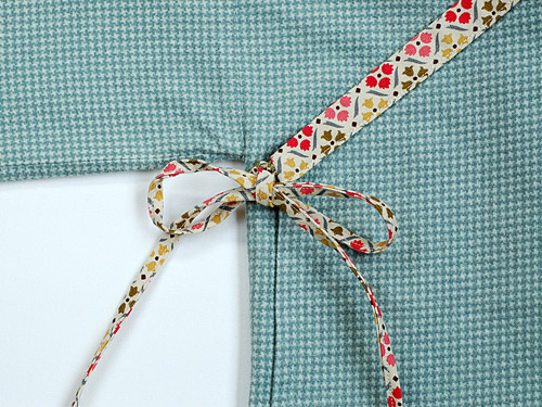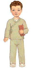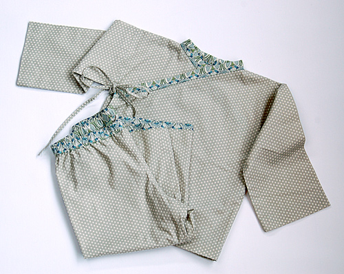 男の子/女の子兼用のキモノ・スタイルのパジャマのパターンです。トップはキモノ風の前でクロスするラップスタイル。パンツウエストゴムで、脇の縫い目がないワンピース・レッグスタイル。裾にかわいいアクセントの切り替えがついているデザインです。