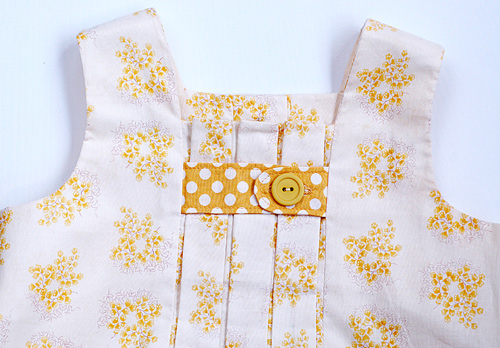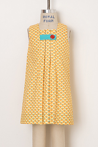 ノースリーブのかわいいAラインドレスの型紙です。ボックスプリーツが中心に入ったデザインで、オプションで胸元にボタンタブまたはリボンタイがつけられます。