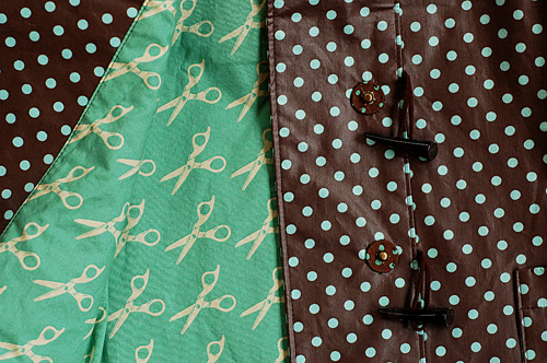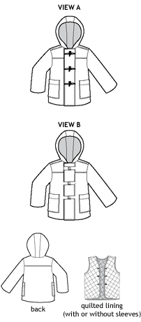 フードつきダッフルジャケット/コートのパターンです。前立てはダッフルボタン(トグルボタン)で留めるタイプと普通のボタンで留めるタイプの2種類から選べます。取り外しできるキルティングライナーの作り方もついているので、冬用のコートとしても暖かく着ていただけます。撥水加工の布やラミネートクロスなどで作るレインコートの型紙としてもお使いいただけます。